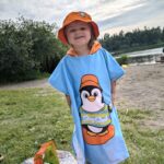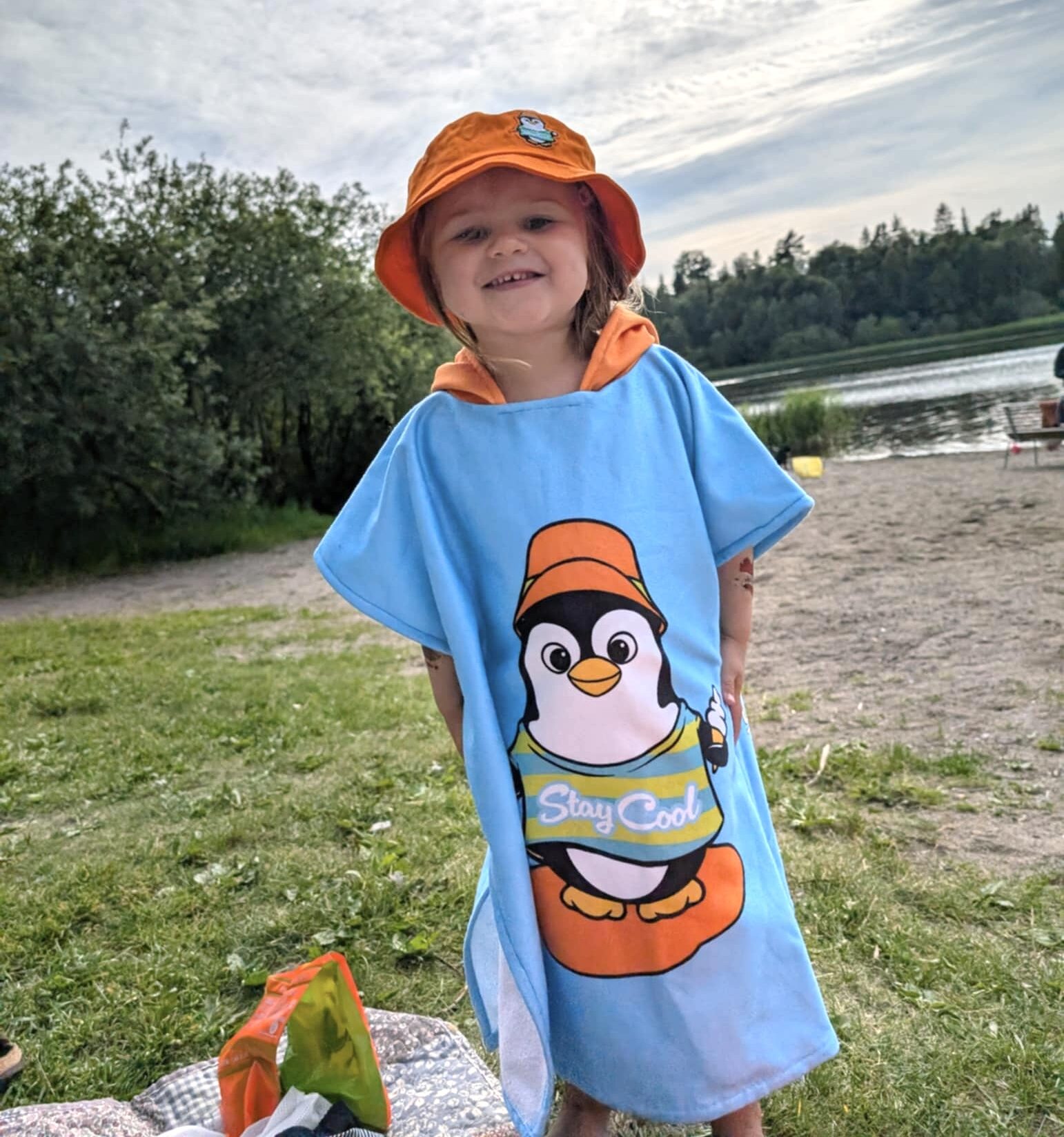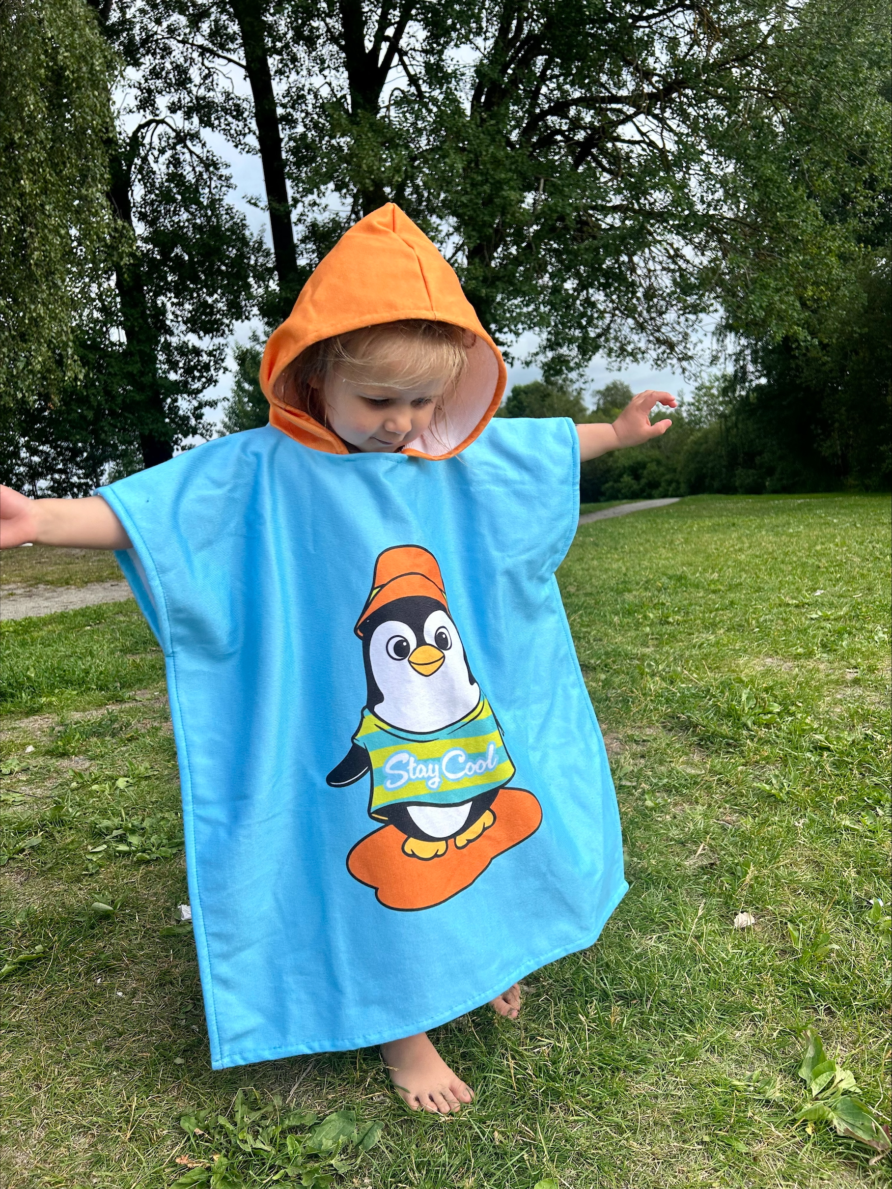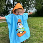 Håndkle poncho til barn i one size. Perfekt til å ha til før og etter bading, ute eller inne. Ponchoen er i nydelig oransje med en søt pingvin på. Håndkle er laget av 50% bomull og 50% polyester. Forside i myk velourpolyester, bakside i hvit bomullsfrottè for maksimal absorbering.